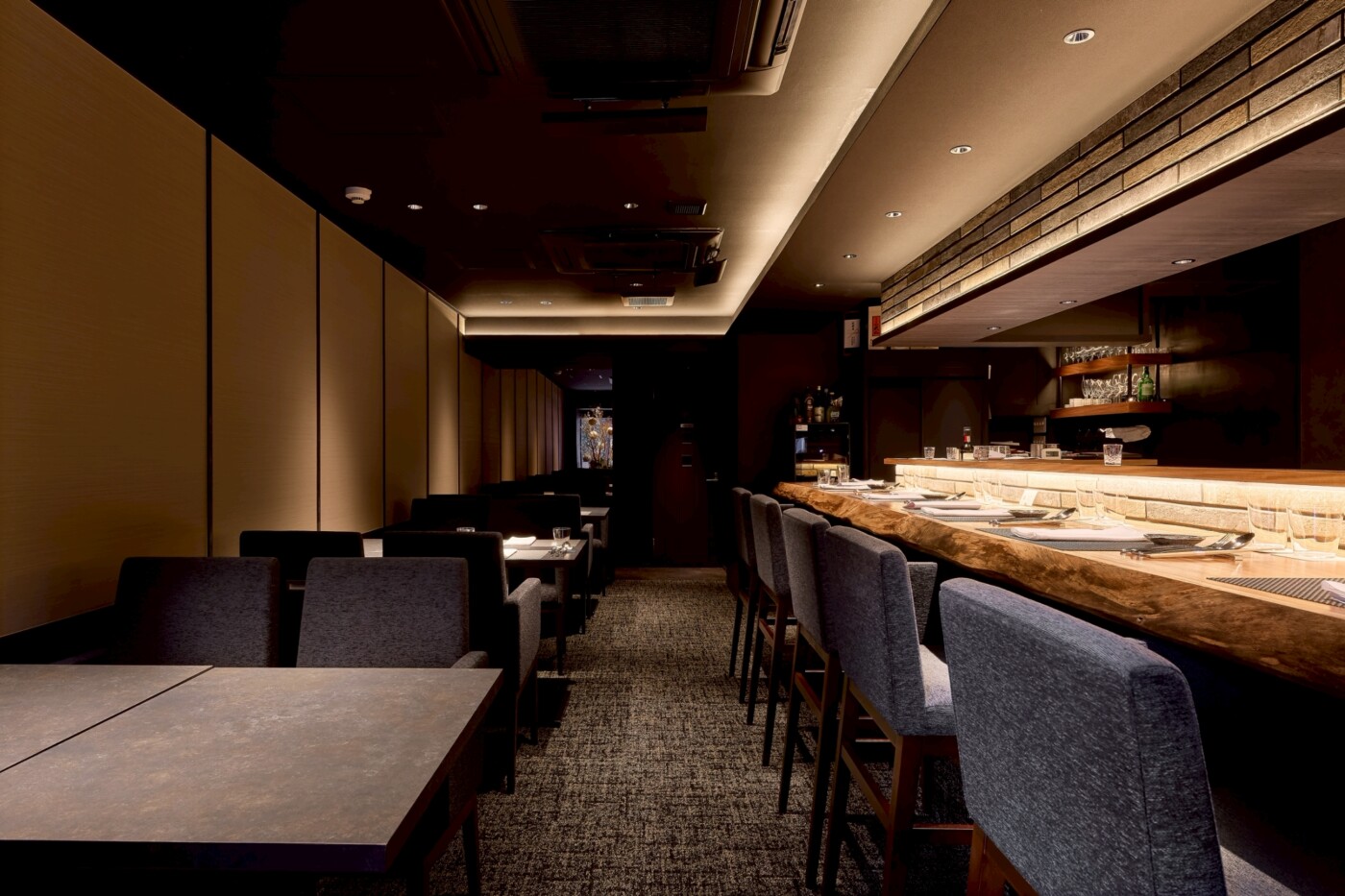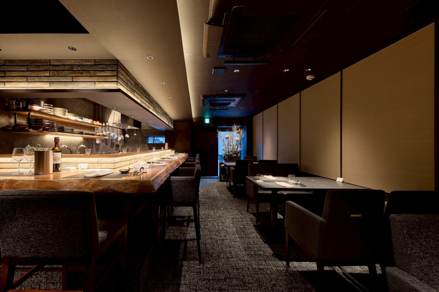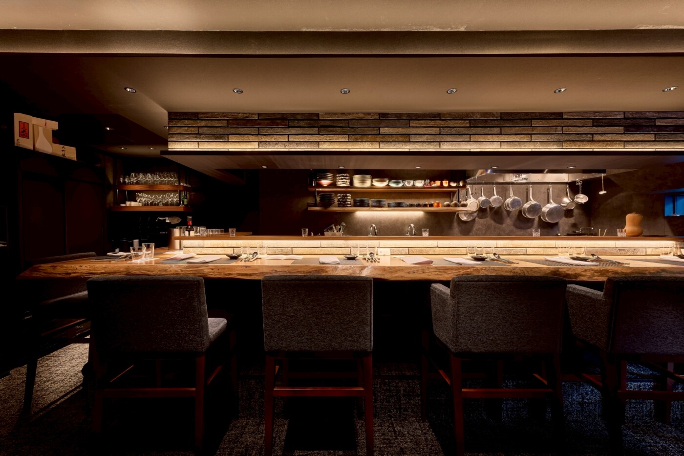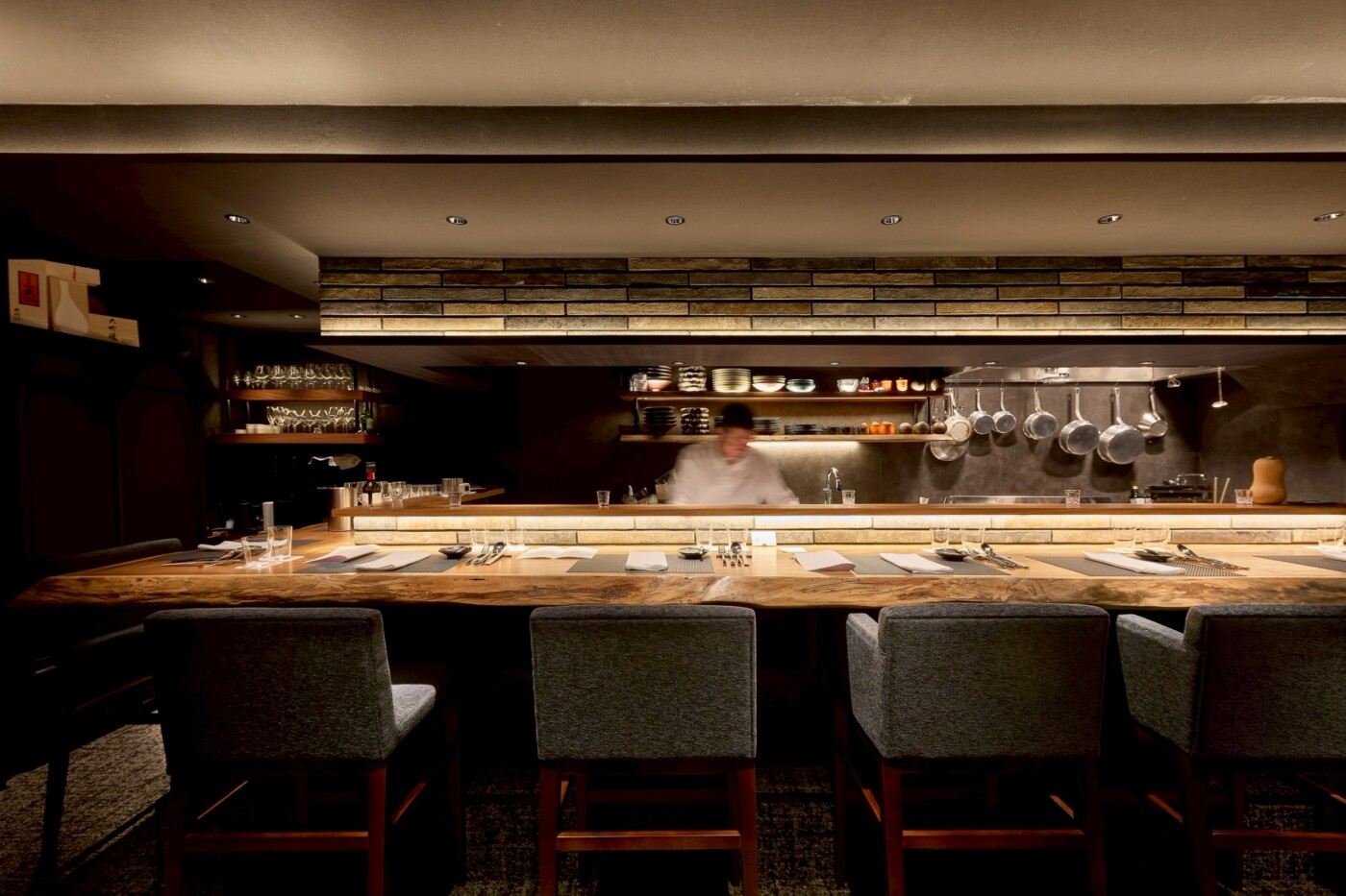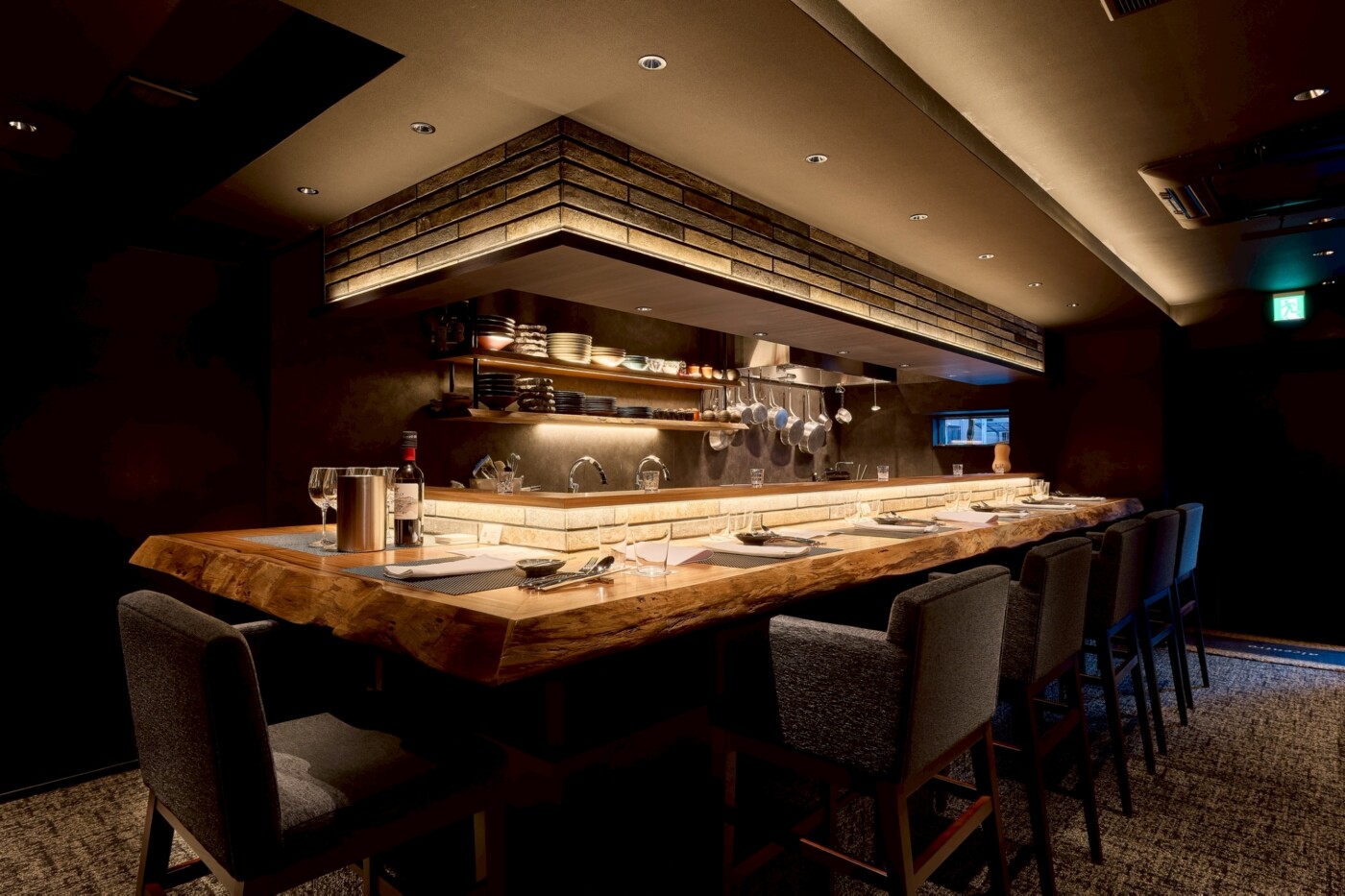 店の象徴となるカウンターには、存在感のある無垢材の一枚板を採用。天然素材ならではの揺らぎと力強さが料理のライブ感と響き合い、ダイニング体験に深みを与えている。