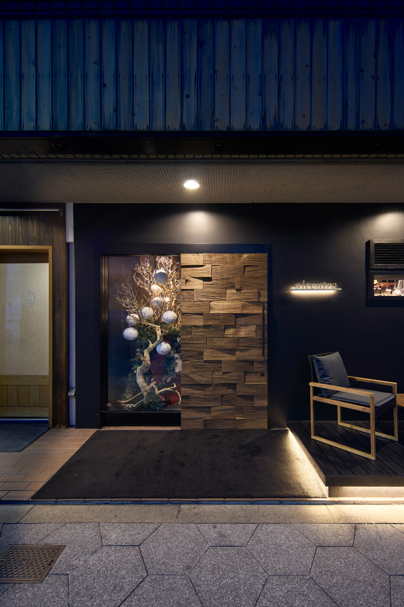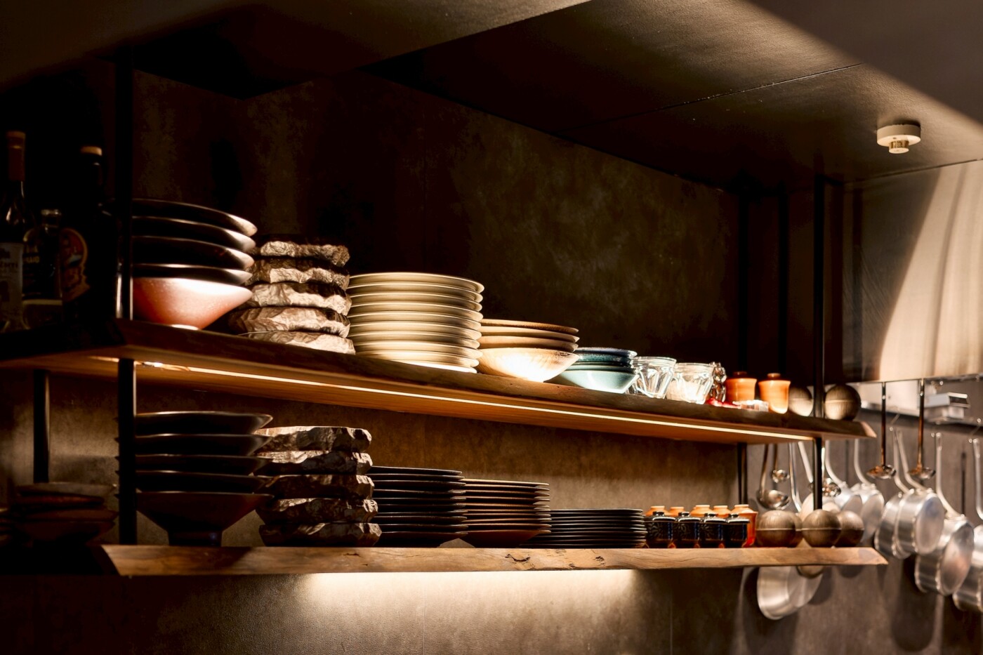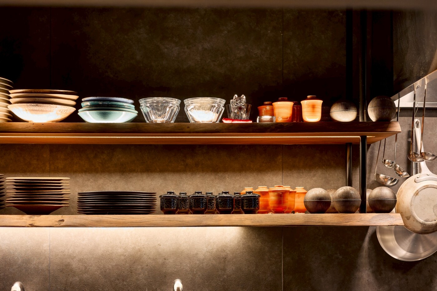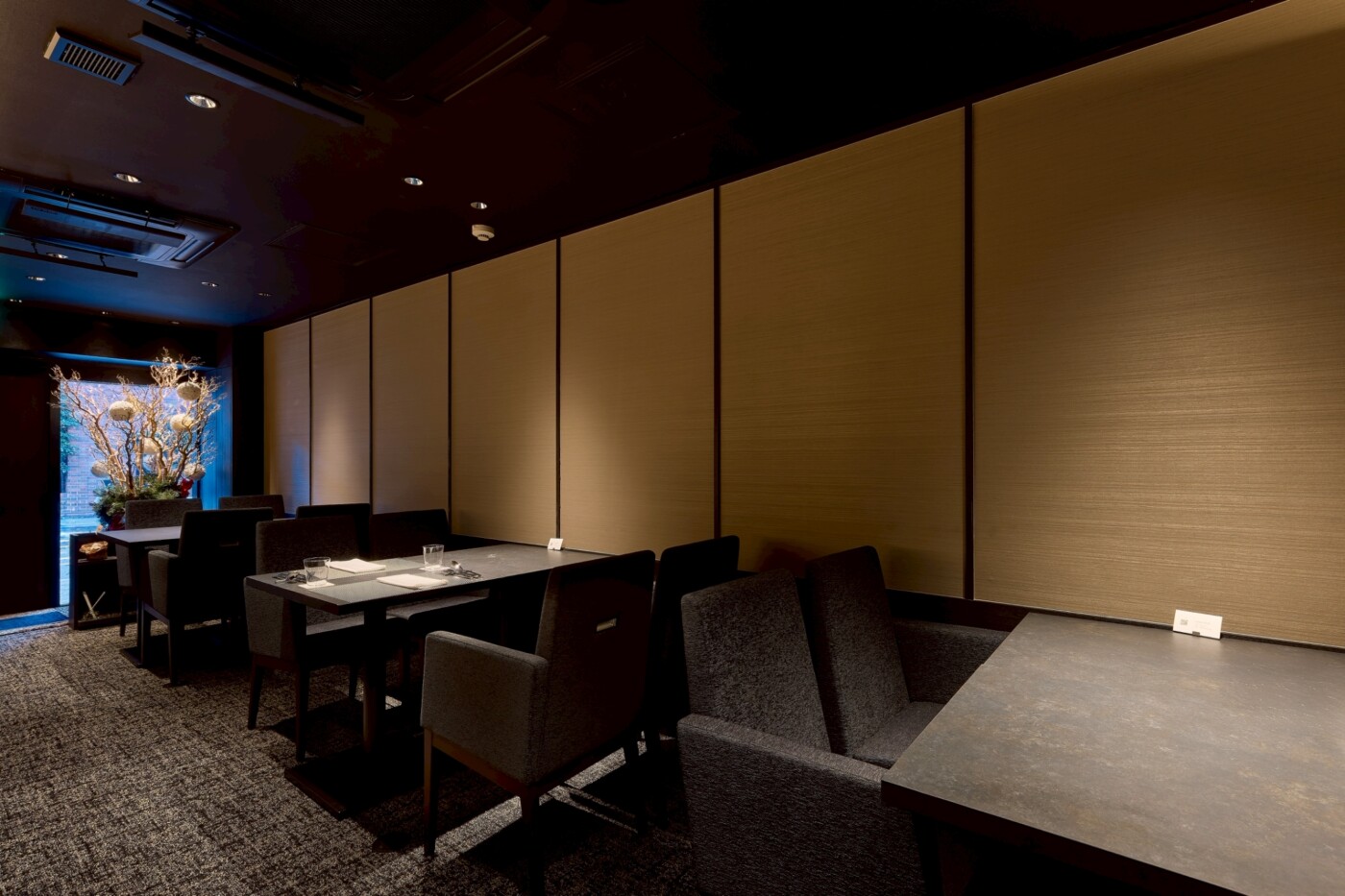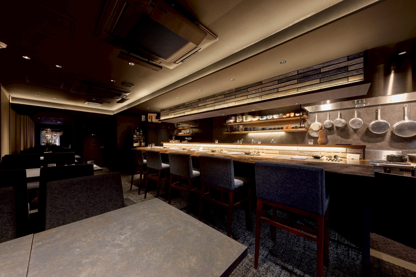 店の象徴となるカウンターには、存在感のある無垢材の一枚板を採用。天然素材ならではの揺らぎと力強さが料理のライブ感と響き合い、ダイニング体験に深みを与えている。